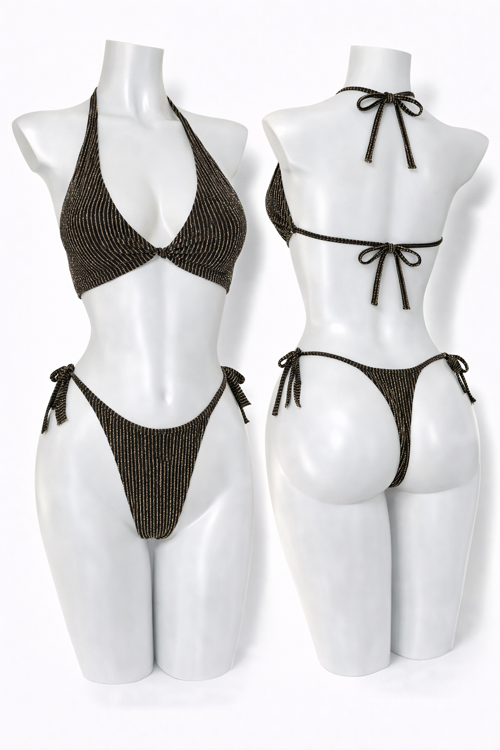 This ribbed shimmering lingerie set is one of those pieces that just feels special the moment you put it on. The soft ribbed fabric catches the light beautifully, while the tie-back halter top and thong back keep it delicate, flattering, and adjustable. It’s simple, confident, and made to feel amazing on your skin.